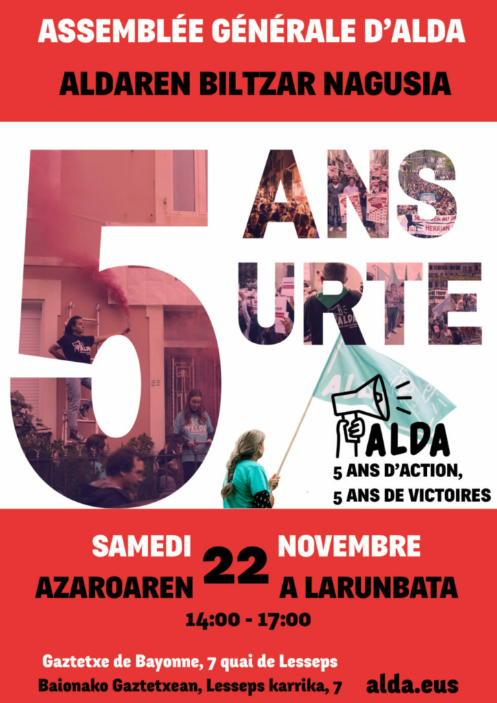Déjà 5 ans ! Pour fêter cet anniversaire et faire le point collectivement sur le chemin parcouru, les combats menés et les nombreuses victoires individuelles et collectives obtenues, le Conseil d’administration d’Alda vous convie le samedi 22 novembre 2025, de 14h à 17h à Bayonne pour l’Assemblée générale d’Alda.