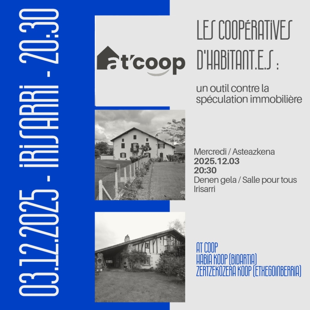 Dans un contexte de crise du logement et d’urgence écologique, des citoyen·nes inventent de nouvelles façons d’habiter : collectives, sobres et solidaires. Rencontre avec des membres de la coopérative d’habitants Habia à Irissarry qui montre qu’habiter autrement, sans spéculer, sans bétonner, et en créant du lien social… c’est possible. Pour aller plus loin, ne manquez pas la réunion publique sur les coopératives d’habitants du 3 décembre à 20h30 à la Salle pour tous d’Irissarry.