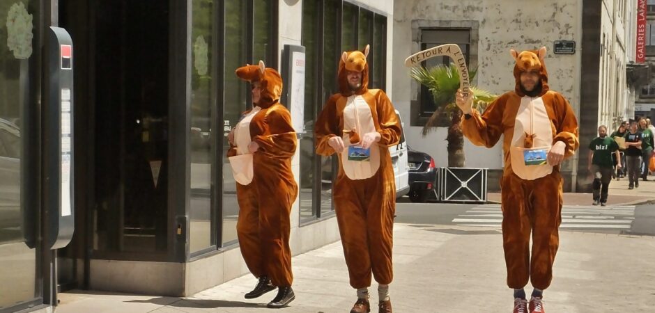 Ce mercredi 14 mai à 14h30, 3 militants de Bizi habillés en kangourous se sont introduits dans la direction régionale de la Société Générale à Bayonne et ont demandé à être reçus par le directeur.