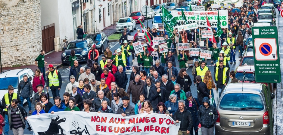 2500 pasa jende bildu ditu Larunbatean, irailaren 16an, Baiona zeharkatu duen "Stop-Mines-EH"k deitutako urre meategien kontrako manifestaldi aldarrikatzaileak.