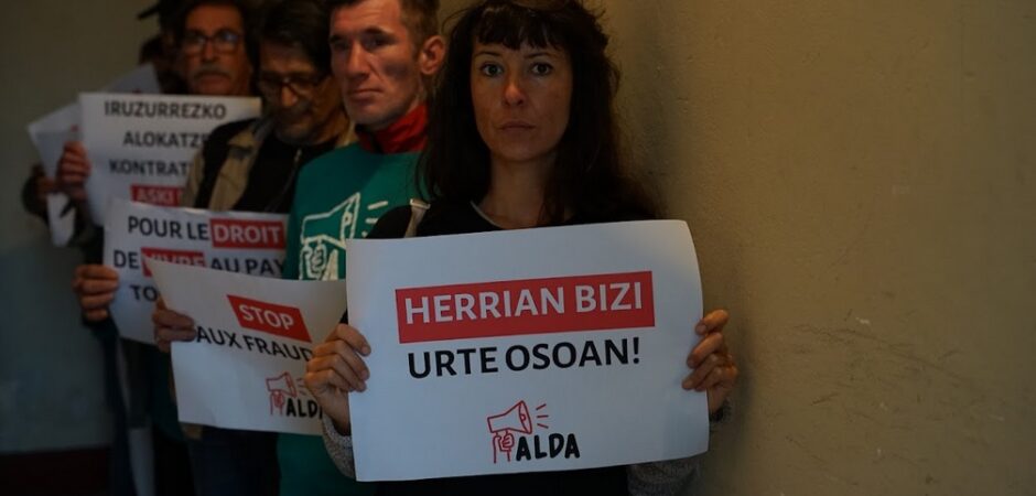 35 lagun elkartu dira Aldak deituriko elkarretaratzean ostegun honetan, ekainaren 30ean Bokaleko Fabien koronelaren plazan. Kevin Salles eta Sandra Branco jabeek, 3 urteko umea duten bikote bati etxebizitzatik ateratzeko lekuaren egoera-akta luzatu diote eta horren aurka egitea helburu izan du elkarretaratzeak.
