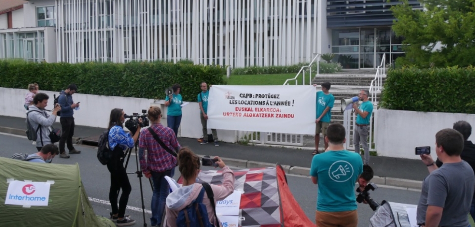 37 militants de l'association ont relié par un chemin fait de tentes de camping le pôle territorial de la Communauté d'Agglomération du Pays Basque (CAPB) au siège social de Poplidays. Cette société, créée par Carmen Immobilier, est spécialisée dans la location de logements entiers proposés en meublés de tourisme permanents. (…)