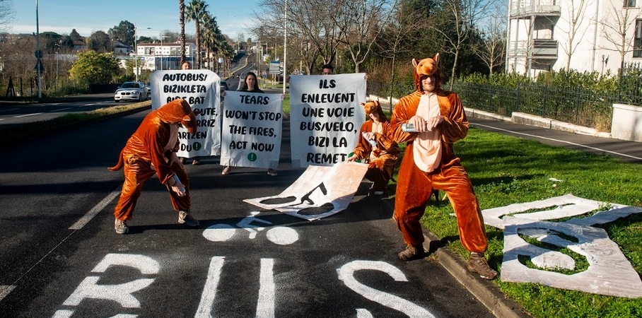 Ekintza gauzatua izan da bereziki kanguruz mozorrotuak ziren ekintzaile zonbaitetaz, Australiak pairatzen duen larrialdi klimatikoari erreferentzia eginez. Horren bidez, Bizik oroitarazi du berotegi efektuko gasen isurketek, gureak barne, dituztela ondorioztatzen klima nahasmenduaren larritze eta zalutzea. Bizik kontsideratzen du onartezina dela bide horren «Dena Autoari» berriz uzterat. (...)